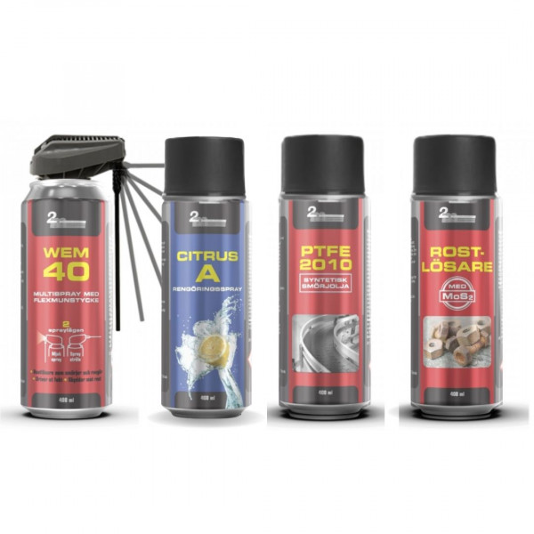 Nu erbjuder vi våra mest efterfrågade underhållsprodukter samlade i ett färdigt och prisvärt paket. 2M Underhållskit Spray innehåller allt du behöver för rengöring, smörjning, rostlösning och allmänt underhåll – perfekt för verkstad, industri, fastighet och servicefordon.