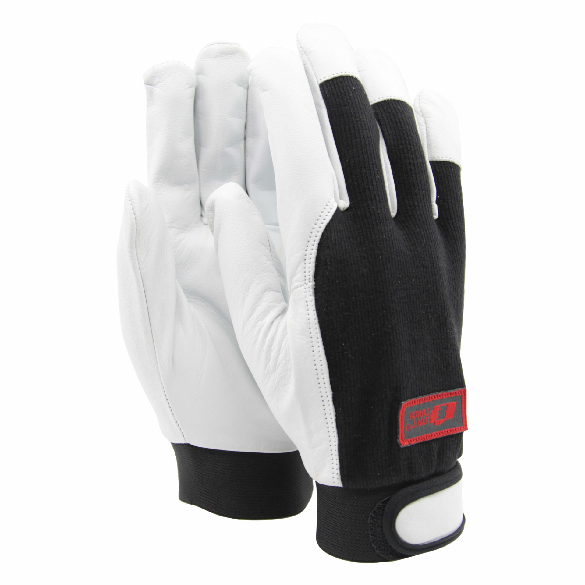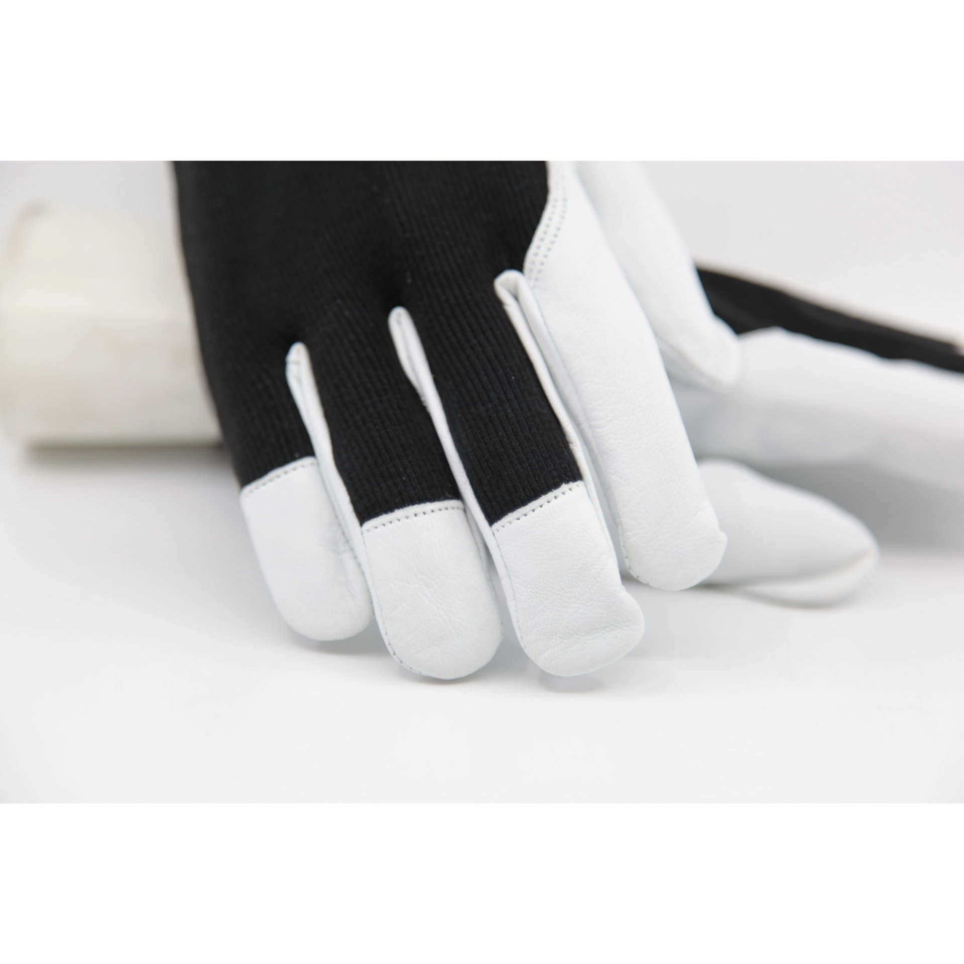 Monteringshandske i getnarvläder med svart, ribbat bomullstyg på ovanhand och kardborreband. Fingertoppsförstärkt med helt pekfinger, vilket gör att handsken passar bra till enklare svetsarbeten. Kardborreknäppet gör att handsken sitter säkert på handen. Handsken lämpar sig mycket bra till all slags monterings-, lager-, plockarbeten m m.